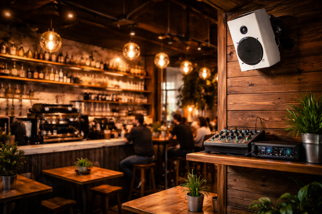 In een café is een goede balans tussen sfeer en geluidsverdeling essentieel. Het geluid moet aanwezig zijn, maar nooit storend — systemen met meerdere speakers zorgen voor een gelijkmatige spreiding en consistente achtergrondmuziek in de hele ruimte.