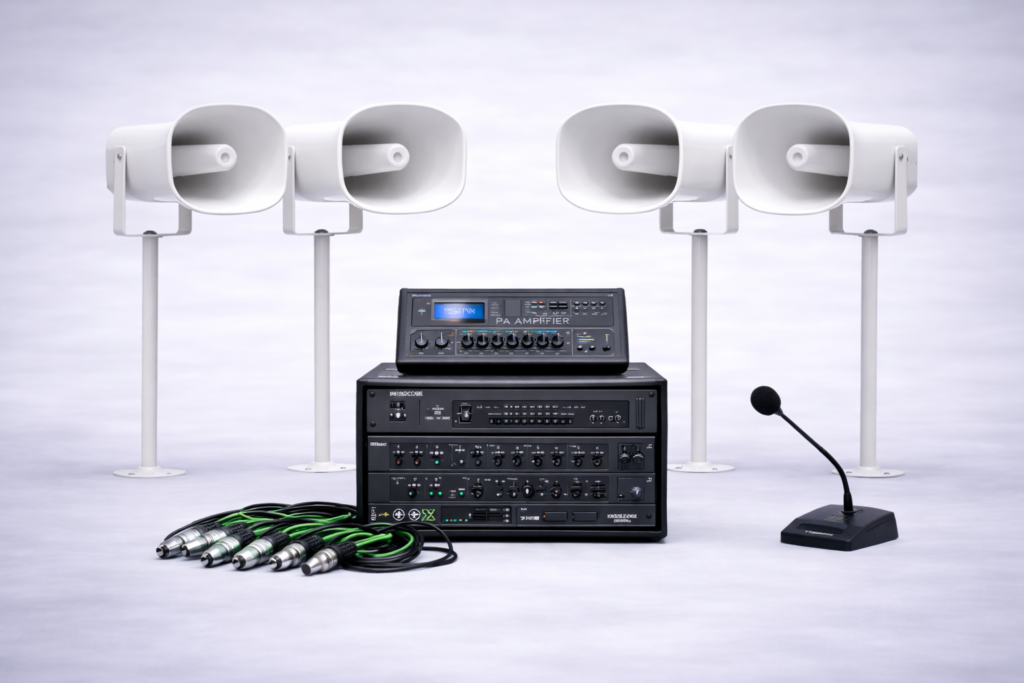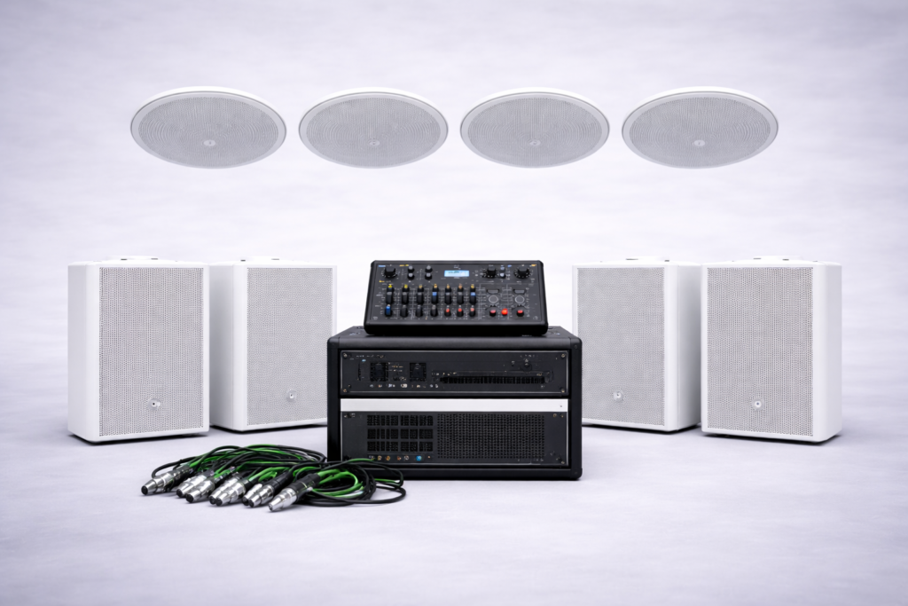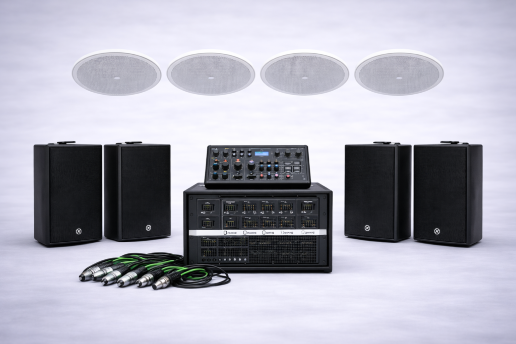 In drukke winkels werk je niet meer met losse speakers of simpele sets, maar met complete audiosystemen die zijn ontworpen voor schaal, controle en continu gebruik. De meest gebruikte oplossingen:
