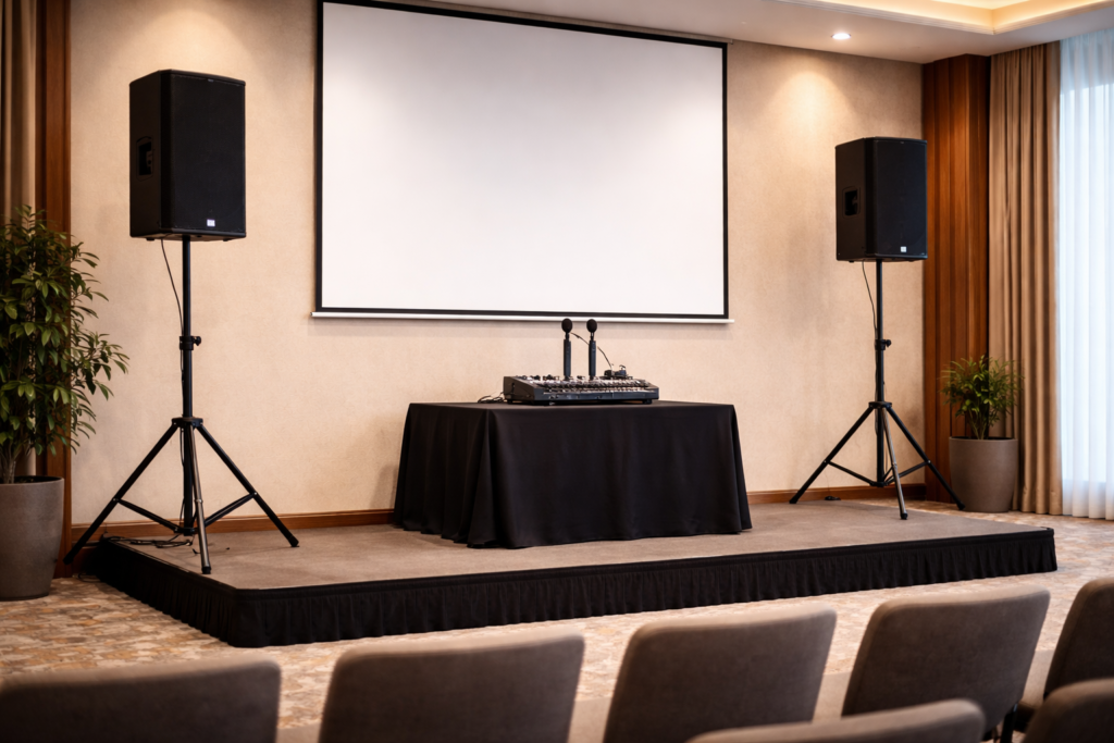 Een geluidssysteem congreszaal tot 100 personen zorgt ervoor dat presentaties en toespraken overal goed te volgen zijn β van voorin tot achterin de zaal, zonder vervorming of ruis.
