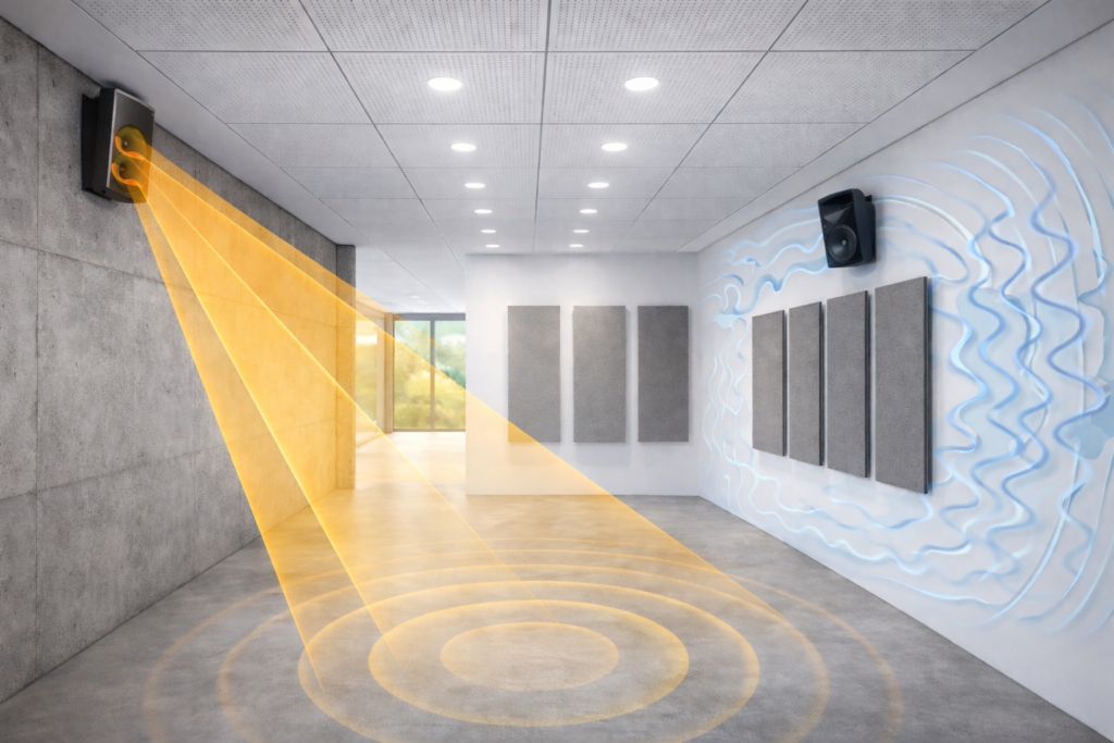 Naast gerichte spreiding speelt ook de interactie met de ruimte een cruciale rol. In galmrijke omgevingen moeten reflecties worden beperkt op de plekken waar ze het meeste schade aanrichten, zoals grote wand- en plafondoppervlakken. Door geluid en ruimte als één geheel te benaderen, ontstaat een gebalanceerd geluidsbeeld waarin spraak duidelijk blijft, zelfs in grote of akoestisch lastige ruimtes.
