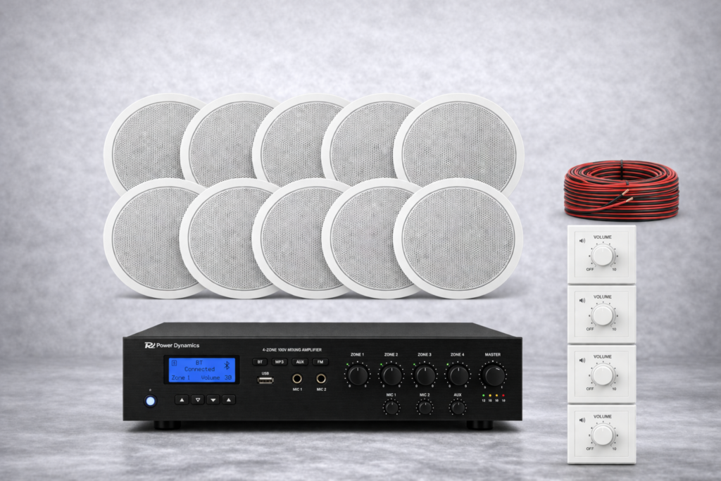 De Power Dynamics 100V speakerset is een complete en direct inzetbare oplossing voor winkels die muziek en omroep willen combineren. Met meerdere speakers en een centrale versterker zorgt dit systeem voor een stabiele en gelijkmatige geluidsverdeling.