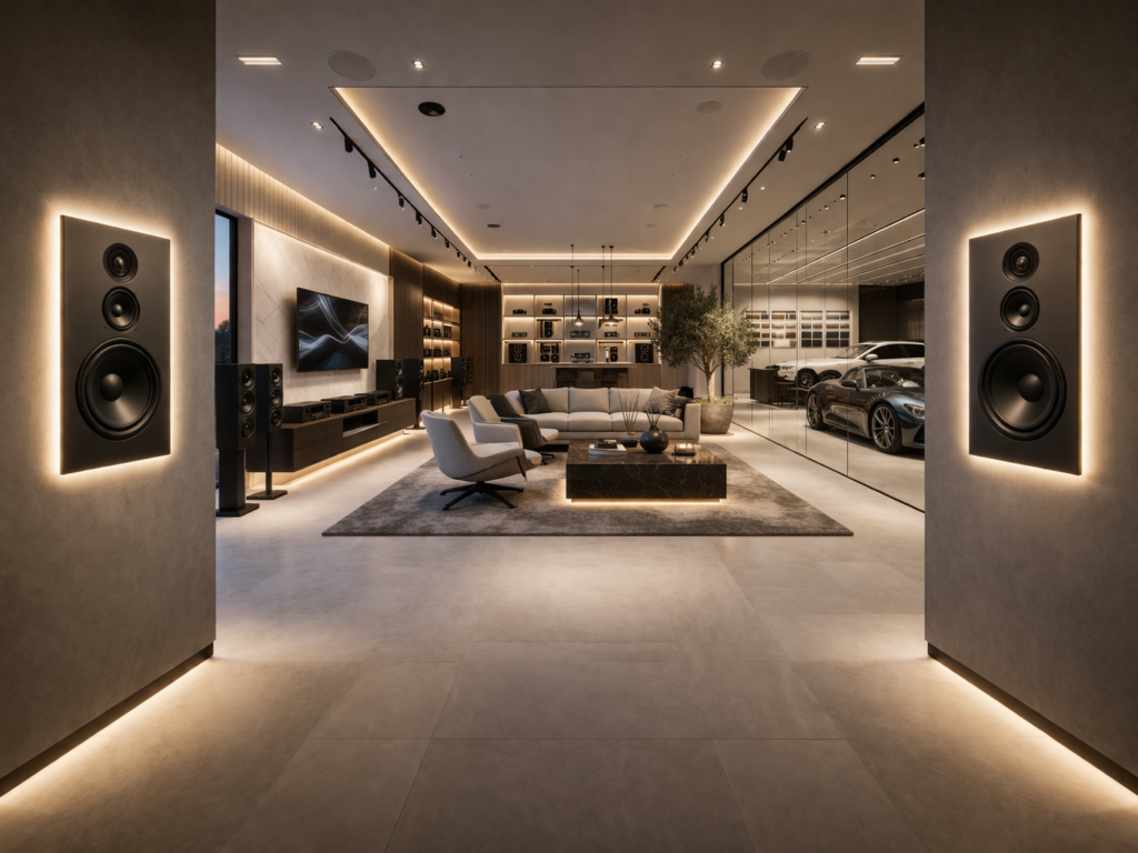 In een showroom is een goede balans tussen geluidskwaliteit en sfeer essentieel. Het geluid moet ondersteunend zijn aan de beleving zonder te overheersen — systemen voor achtergrondmuziek en gerichte zones zorgen voor een consistente en professionele uitstraling.
